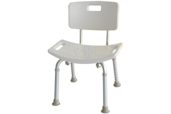 Banqueta de aluminio para ducha perteneciente a la gama INDICO, con asideros integrados en el asiento para mayor seguridad. Con respaldo incorporado.