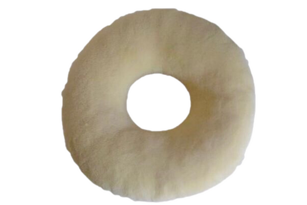 El cojín antiescaras redondo con agujero tiene dos caras externas de diferente composición, la de lana natural para periodos más fríos y la de poliéster para periodos más cálidos y fibra de poliéster siliconada en el interior. Las dimensiones son de 44 x 44 x 11cm. y el peso máximo del paciente hasta 100-110kg.