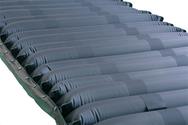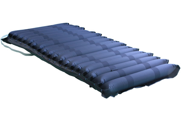 Equipo para pacientes con bajo/medio riesgo de úlceras por presión, compuesto por un colchón de 18 elementos intercambiables (fabricado en PVC/Nylon) con funda impermeable y un compresor de aire regulable.