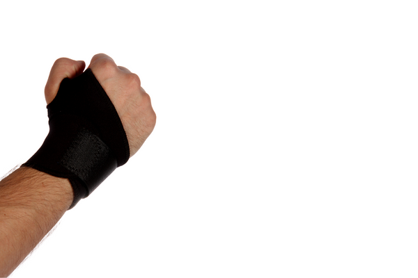 Muñequera confeccionada en neopreno, modelo envolvente que se ajusta con un velcro.